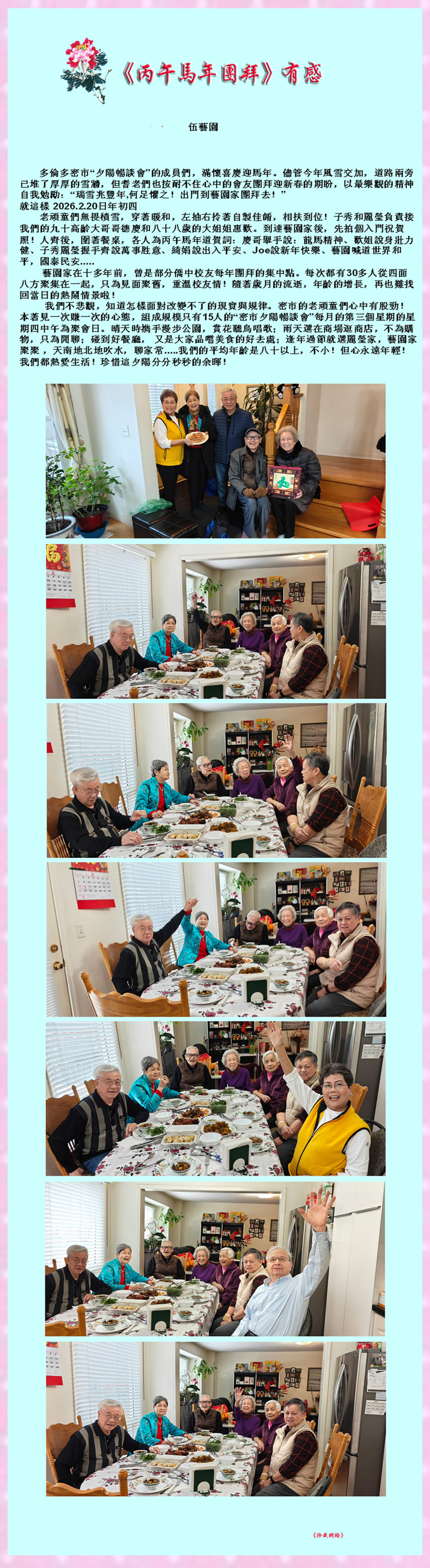 “儘管今年風雪交加,道路兩旁已堆了厚厚的雪牆,但耆老們也按耐不住心中的會友團拜迎新春的期盼,以最樂觀的精神自我勉勵:‘瑞雪兆豐年,何足懼之!出門到藝園家團拜去!’”