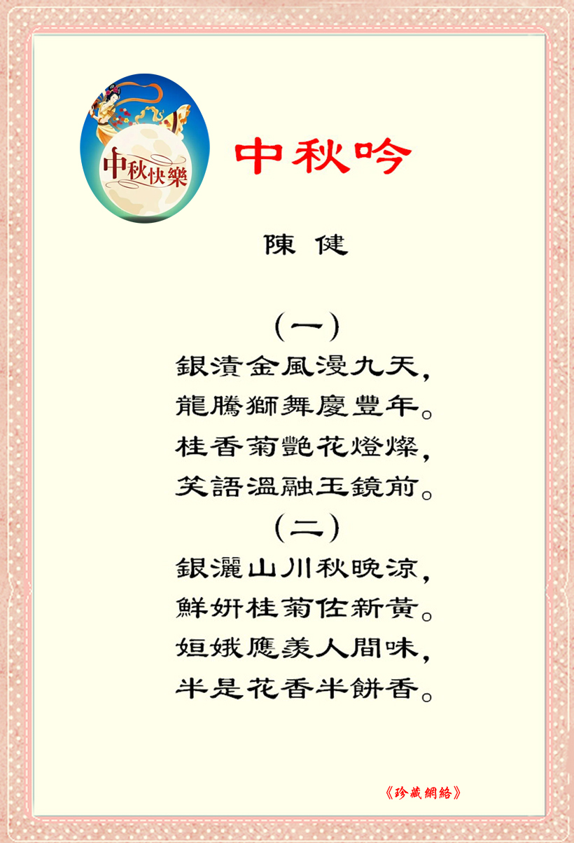 首句“银渍金风漫九天”以“银渍”喻月华流淌,新颖不失古韵,与“金风”共织秋夜清旷。后三句铺陈人间烟火:龙狮欢舞、桂菊争妍、灯影流光,末句“笑语温融玉镜前”巧妙将月轮拟为玉镜,映照团圆温馨,动静相宜,画面感强烈。