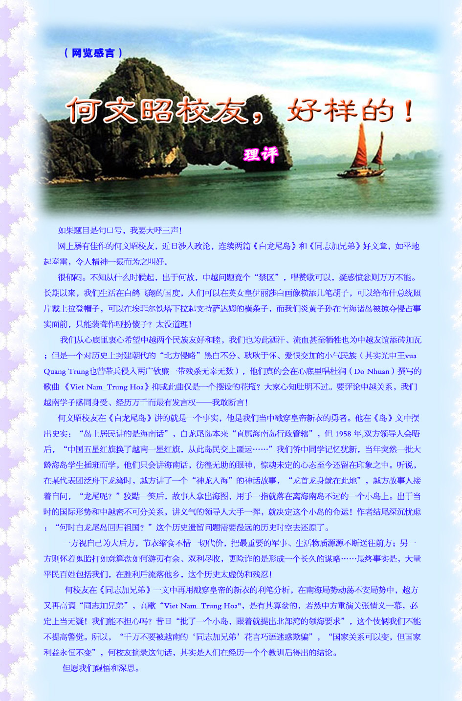 台湾人遇到“统独”问题,大都想绕过这个心照不宣的不愿意跨过的门槛;而我们侨友一提及中越问题大都是模模糊糊“往事不堪回首”、至多哼几句老掉牙“山连水”敷衍了事——这都是现实版的“皇帝新衣”,所以,敢戳破华丽新衣的勇敢“小孩”的确难得。我说一件事: