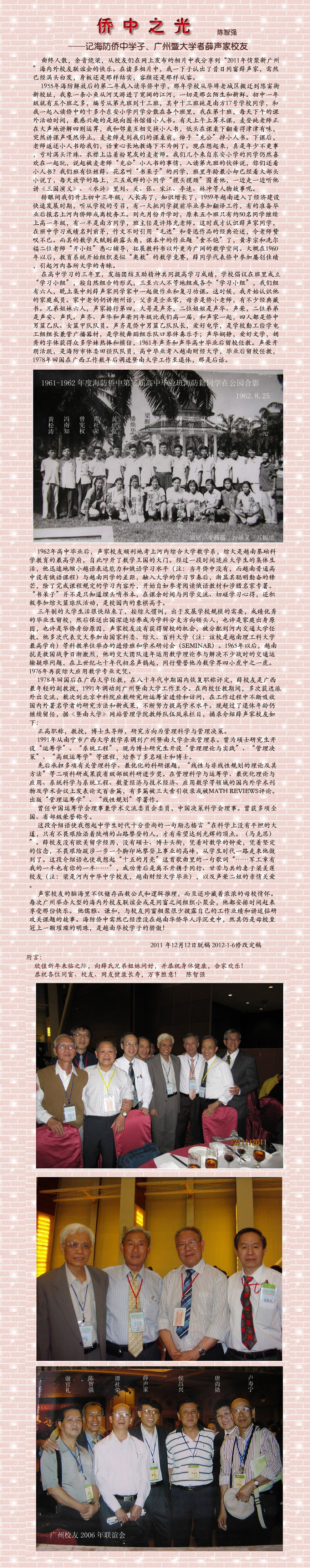 这是一篇情真意切、史料珍贵、人物立体、精神感人的佳作。作者陈智强先生以细腻的笔触和深厚的同窗情谊,生动刻画了海防侨中杰出校友薛声家教授从越南求学、任教到归国奉献的非凡历程,不仅展现了一位学者严谨治学、不懈攀登的动人形象,也为我们保存了一段珍贵的越南华侨教育史和海外华人的奋斗史。旭华的推荐十分精准,此文确实值得一读。