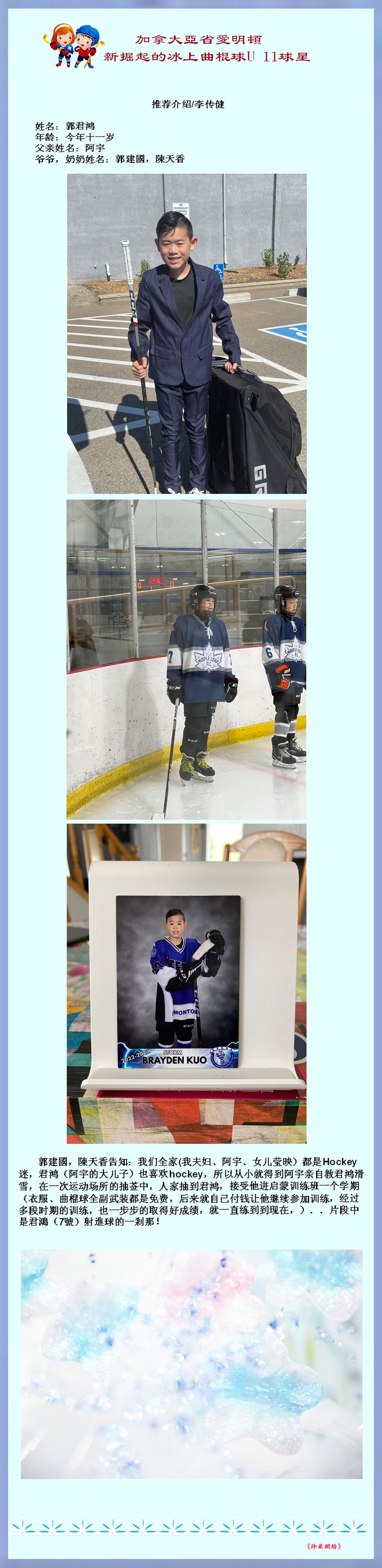 建国,天香,为你们的11岁孙儿君鴻成为爱明顿新崛起的冰上曲棍球 U11的球星而高兴,太棒了 !