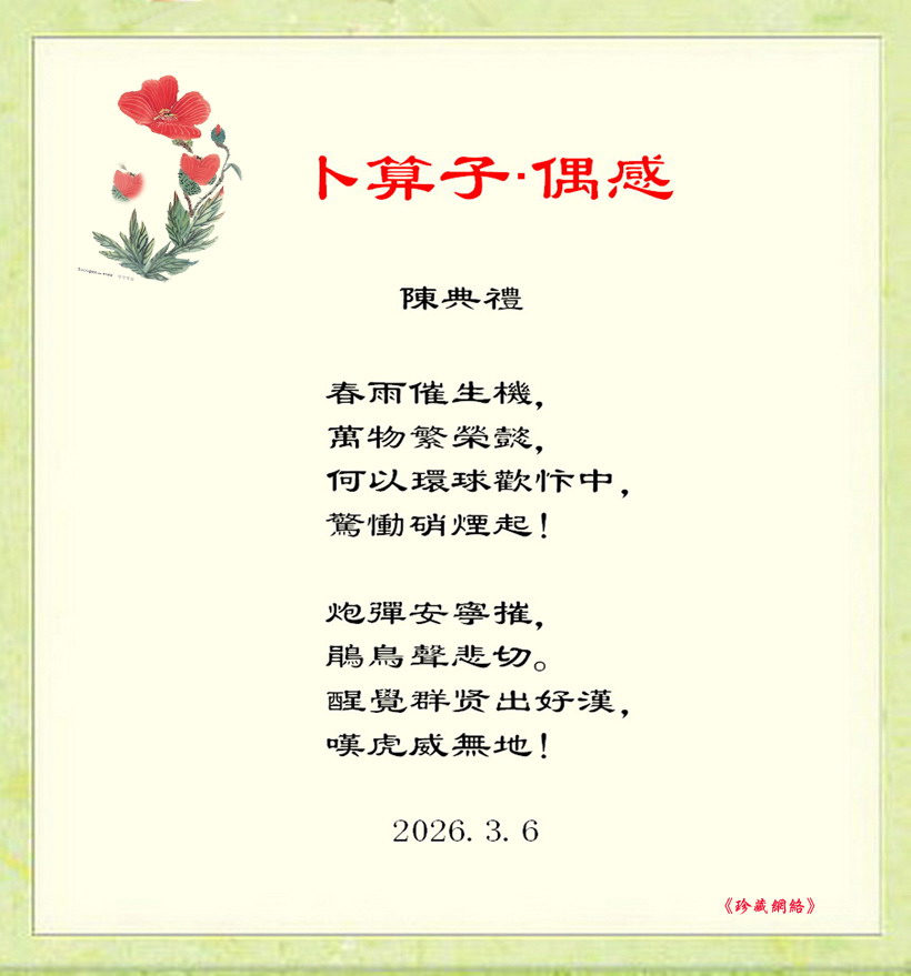 這闋《卜算子·偶感》以春日生機與戰火硝煙的強烈對比,道出對世界和平的深切憂思。我們逐句來賞析: