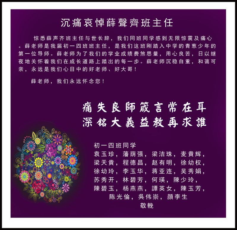 噩耗傳來,晴天霹靂!切切心痛!深深懷念!願薛聲齊老師一路走好!望關恆芳老師及其家人節哀順變!多加保重!