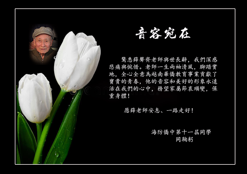 各位侨中校友们,今天是2019年1月3日,我们的校友薛声齐老师于早上6:40分离开了我们,他久病多年,终于解脱了!我们怀着悲痛的心情送别声齐老师,愿他一路走好,安息天国!(伍艺园)与《音容宛在》