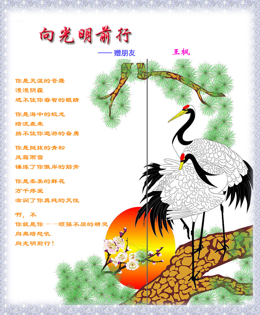 还要谢谢学长以双鹤松梅与火红的朝阳配图,营造了一片宁静、祥和、光明的氛围。