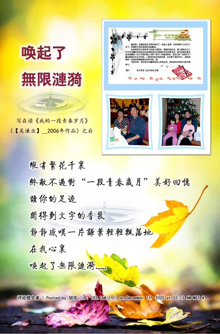 新制版:唤起了无限涟漪__写在读《我的一段青春岁月》(【吴谦业】__2006年作品)之后(黄旭华);美工制版:潘兆韦