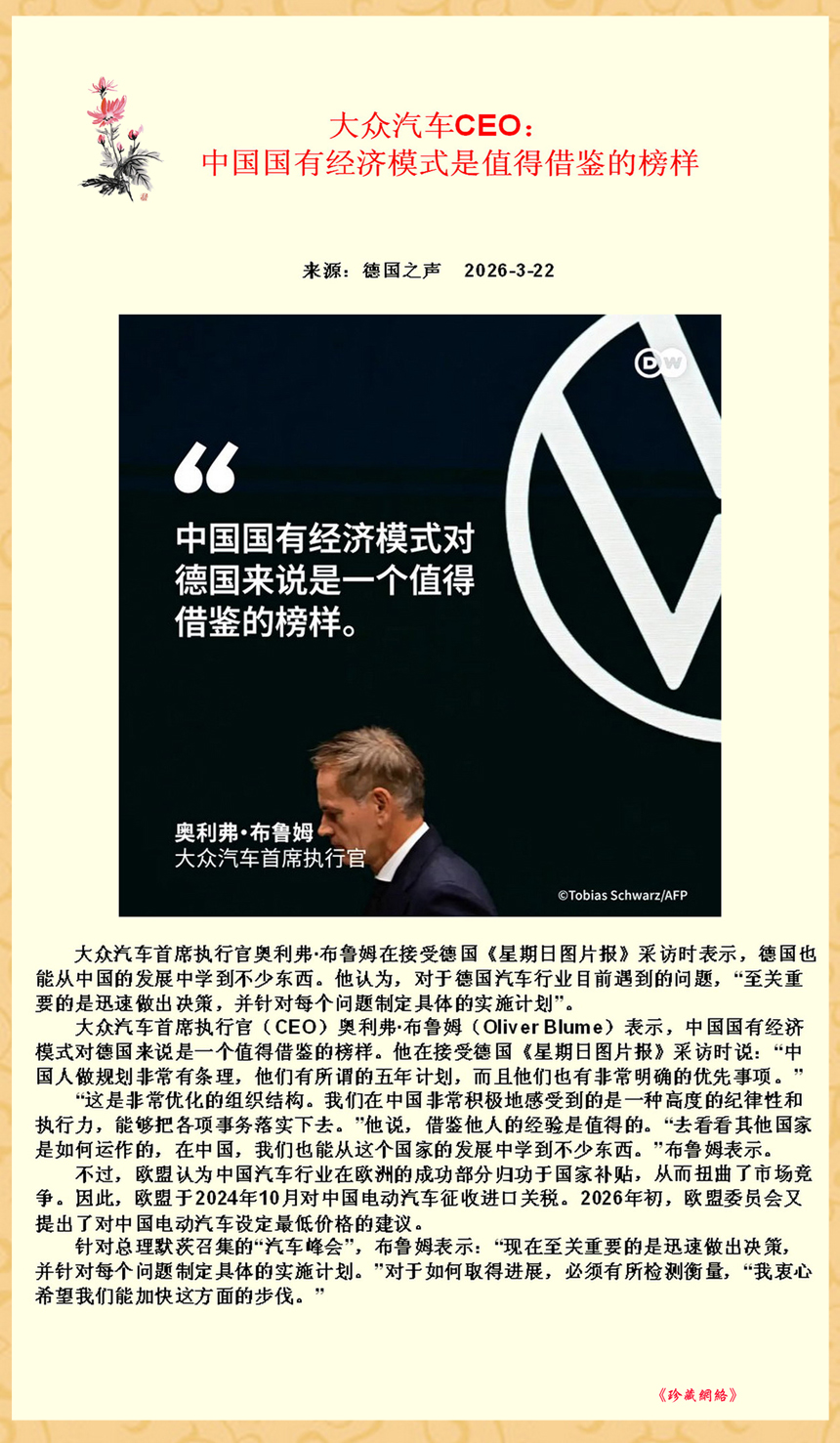 大众汽车CEO:中国国有经济模式是值得借鉴的榜样