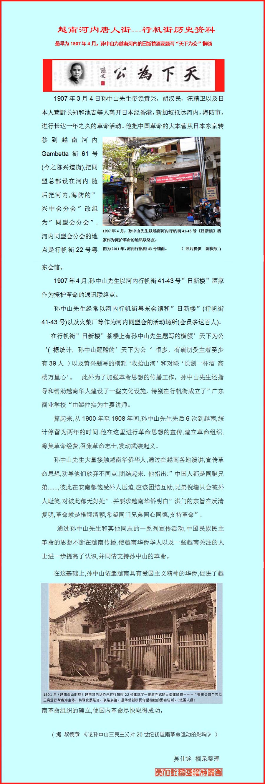 《天下为公》越南河内唐人街--行帆街历史资料( 吴仕铨整理推介)