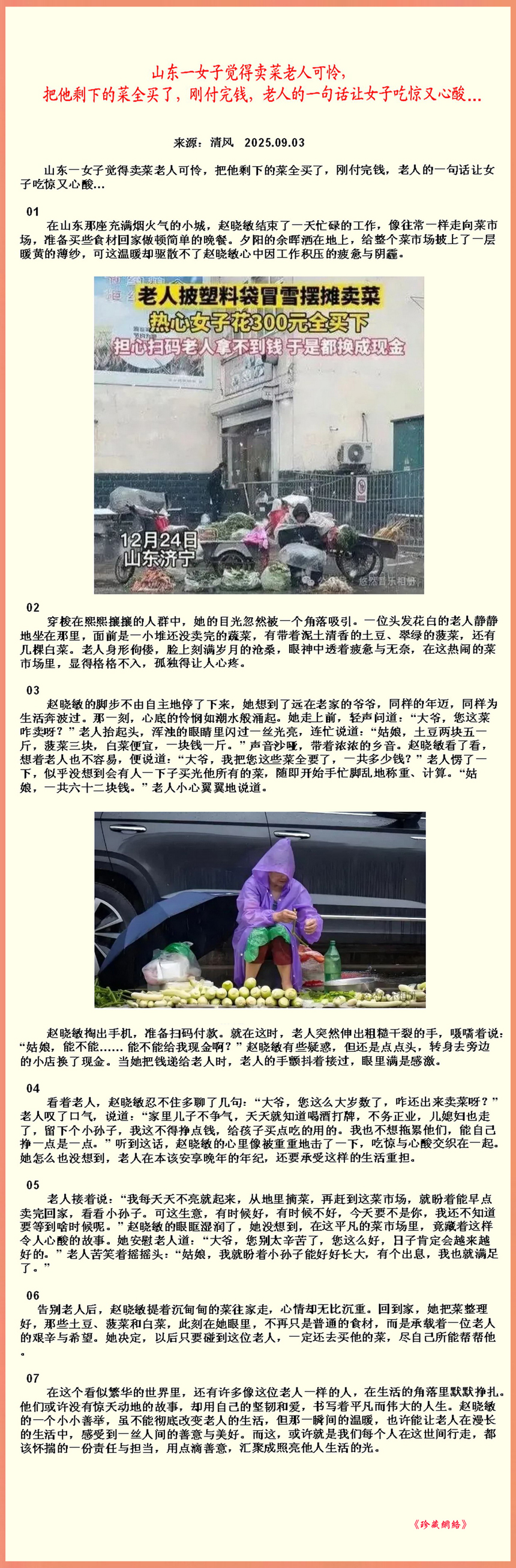 山东一女子觉得卖菜老人可怜,把他剩下的菜全买了,刚付完钱,老人的一句话让女子吃惊又心酸。