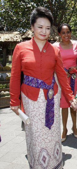 彭丽媛身着红色立领衬衫搭配民族风印花长裙惊艳亮相,整身LOOK端庄别致,喜气洋洋又不失主席夫人风范。阿妮在入口处迎接彭丽媛,并亲手为彭丽媛系上印尼传统服饰“纱笼”,以表友好,彭丽媛也同其他亚太经合组织经济体领导人配偶合影并寒暄。