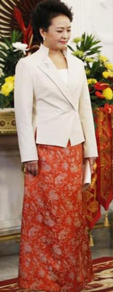 印尼之行,同一件上衣,不同的裹身裙,彭丽媛身穿白色的短款西服搭配橘红色的绸缎印花长裙,长与短的搭配比例协调,整体裙摆的刺绣印花独具中式风格,高雅得体气质不凡。