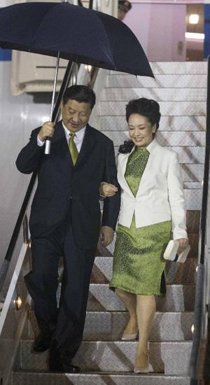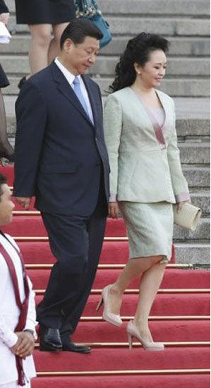 正值雅安地震,所以彭丽媛选择了一身素雅的黑白庄重套装,胸前的绢花高雅别致,别具匠心地微斜襟的设计,既生动又端庄大方。