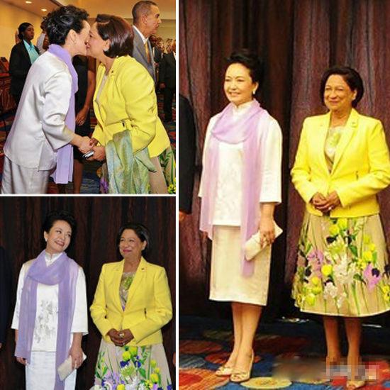 香芋粉紫色的纱巾轻薄温婉,精致的真丝刺绣绸缎套装柔美典雅,珍珠色尽显中式高贵,与身旁特多女总理热情洋溢的鲜艳热带风情形成对比。