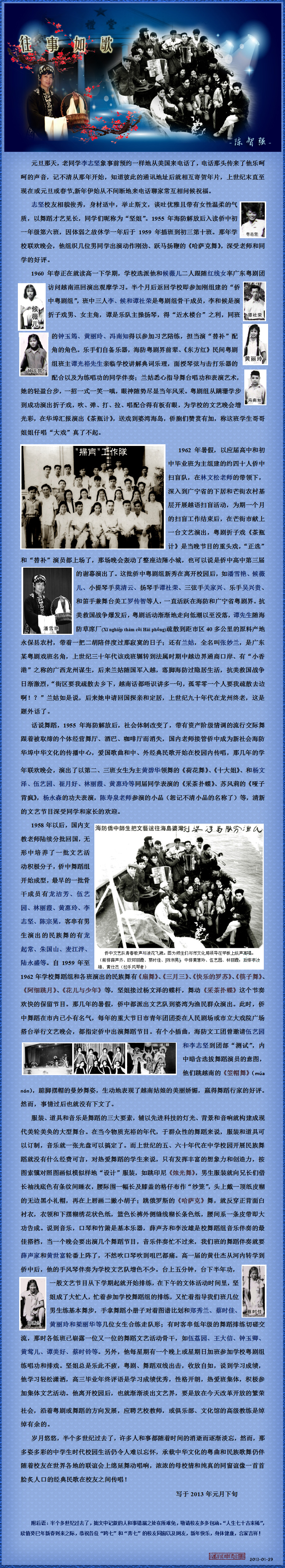 2,生动的人物群像刻画: 文章成功塑造了以“坚姐”李志坚为代表的一群鲜活、饱满的师生形象。作者不仅描绘了李志坚俊秀的相貌、优雅的谈吐和卓越的艺术才华,更通过他组织舞蹈、学习粤剧、指导同学等具体事例,展现了他热情、无私、多才多艺的品格。同时,文中提及的兰姑、谭光裕先生以及众多同学(如伍艺园、谭社荣、候薇儿等),虽着墨不多,但形象清晰,共同构成了一幅充满生命力的侨中师生群像图。