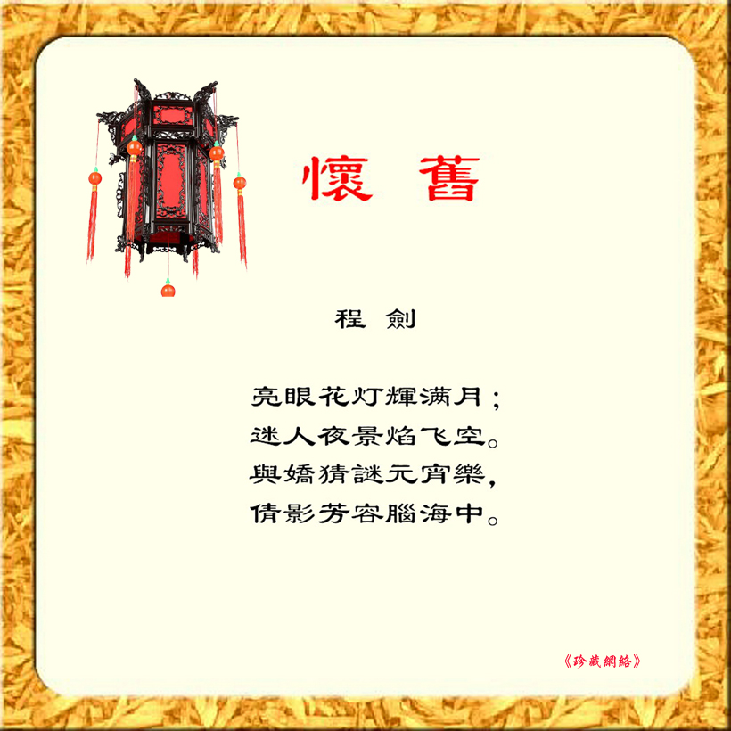 后两句笔锋陡转,“與嬌猜謎元宵樂”以口语化的“嬌”字唤起温馨记忆,元宵猜谜的互动场景跃然纸上。尾句“倩影芳容腦海中”以现代汉语“脑海中”收束,形成古典意境与现代语汇的巧妙融合,灯火阑珊处,昔日笑靥与今宵焰火在记忆深处重叠,余韵悠长。全诗短短四句,完成从眼前实景到心中虚像的时空跳跃,怀旧之情含蓄而深切。
