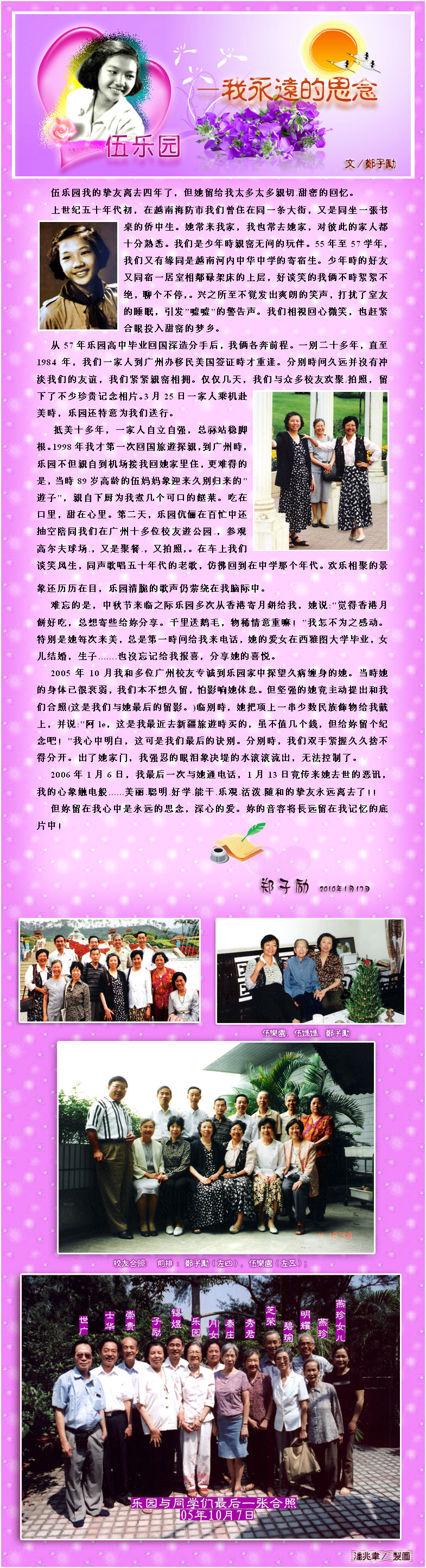 收到由艺园,子励,正义,晴光等学长寄来有关乐园学姐的照片三十多张,我都寄给兆韦学兄。我想:兆韦兄肯定又睡不着了!果然是,为了配合本文作者所说:“.....挚友已离去四年,但她留给我太多太多亲切甜蜜的回忆!”的心意,兆韦兄用功思考选色,选图,当晚,足足花了六个小时完成了这一天衣无缝,完美结合的美工之作!