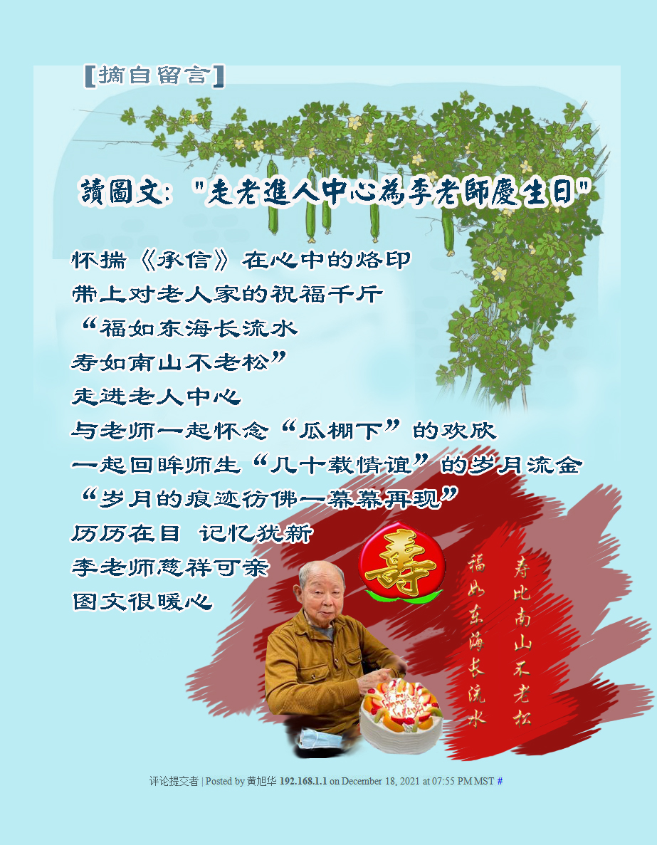 [摘自留言] 读图文:"走進老人中心为李老师庆生日" (留言者/黄旭华)