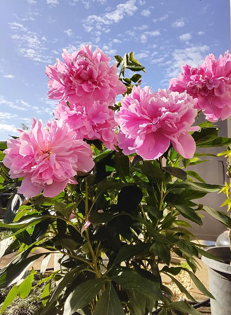 这幅作品捕捉了牡丹在自然春光中的雍容与生机。画面以一株牡丹为主体,五朵浅红色的花朵错落盛开,构图稳重而不失灵动。选择蓝天白云作为背景,是极佳的色彩策略:蓝与粉红形成冷暖对比,既突出了花瓣的柔嫩、通透,又使整幅画面充满清朗的春日气息。