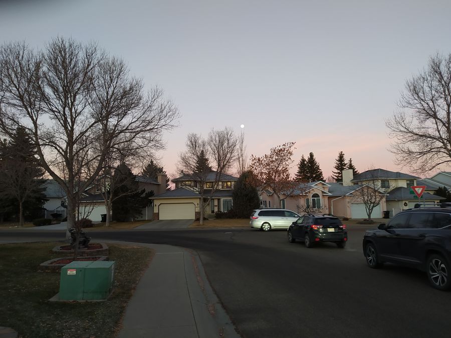 好天气的早晨。游泳之后,争取在住宅区周围走一圈(一个小时)。今天(28日)早上,手机随拍这一月亮美图。(下图)
