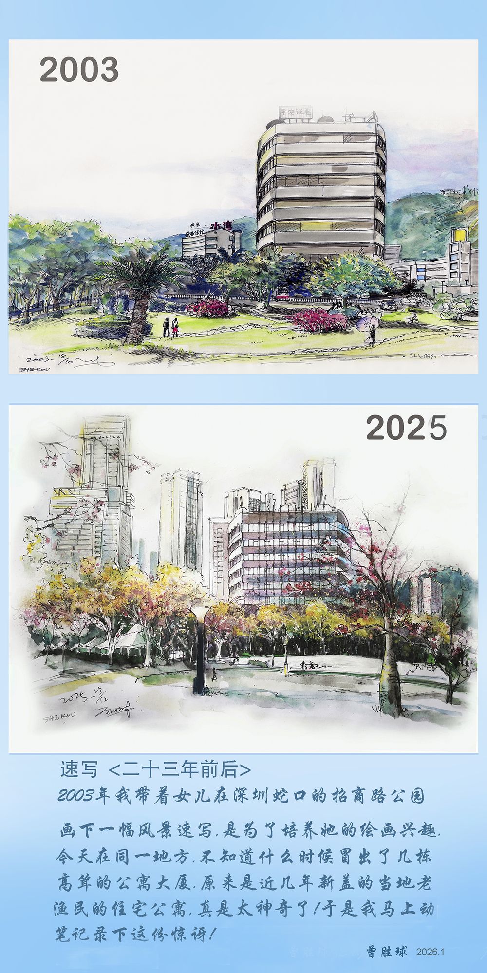 1,从“观察者”到“建设者”与“父亲”的双重身份:您不仅仅是2003年在公园写生的父亲,更是1980年便投身蛇口工业区建设的开拓者。这幅画因此拥有了前所未有的深度——它不仅是个人记忆的对比,更是一位“开荒牛”对自己亲手参与建设的土地的深情回眸。画中2003年的风景,本身已是您奋斗二十余年的成果;而2025年的巨变,则是您们那一代人播下的种子在新时代结出的硕果。您用画笔记录的,是自己生命的年轮与时代年轮的重叠。