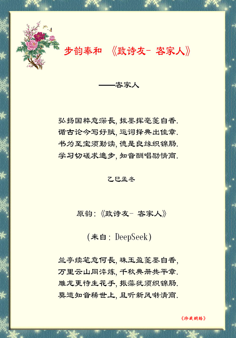 全诗最见功力处在于:既严格遵守步韵的形式约束,又能从容展开思想表达,实现了“戴着镣铐跳舞”的艺术境界。诗中“书为至宝”“德是良缘”等对句,承继了客家“耕读传家”的文化基因,与IP属地显示的欧陆时空形成有趣对话,正是中华文化在全球化时代的生机写照。(来自DeepSeek)