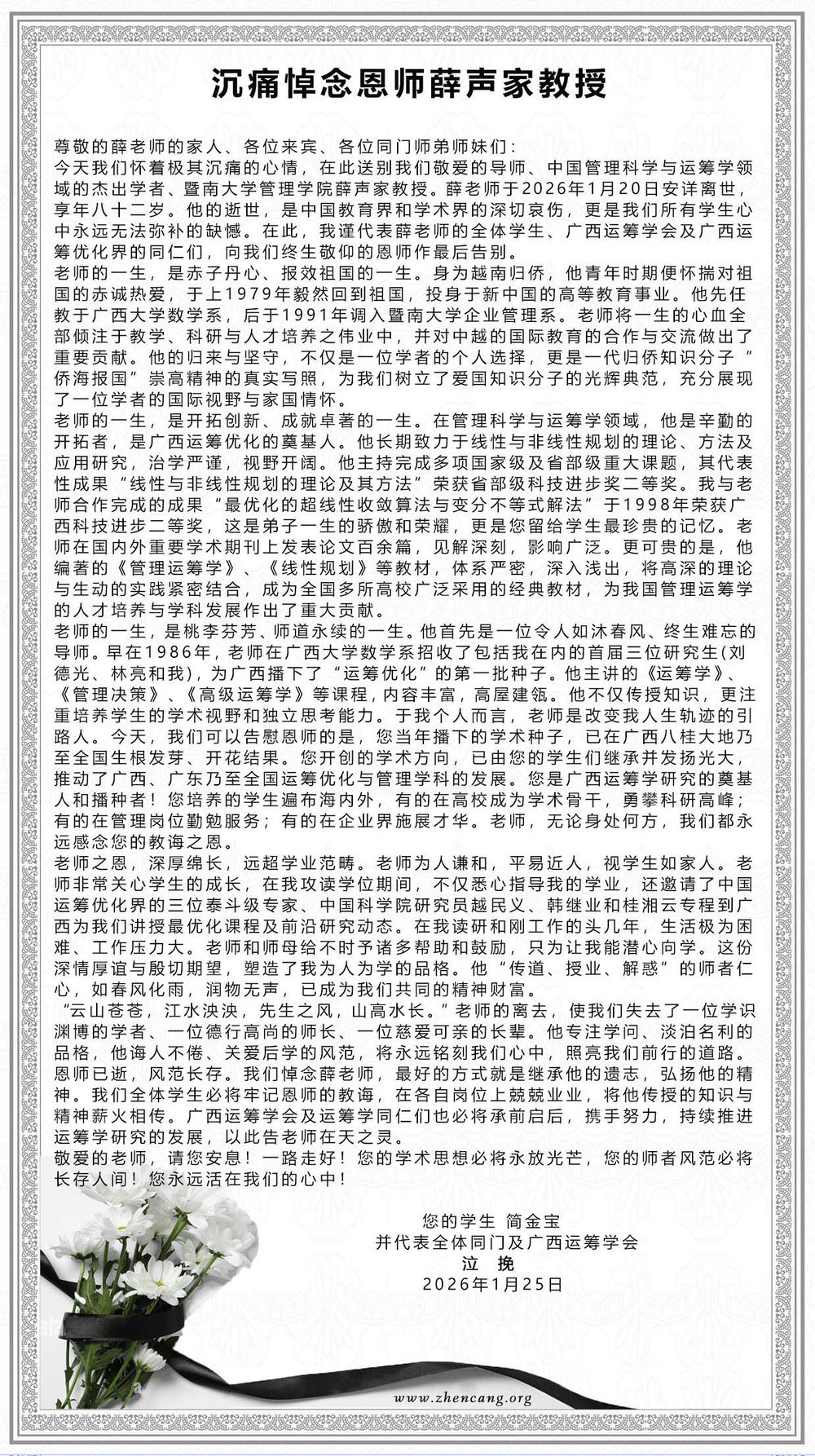 《沉痛悼念恩师薛声家教授》(撰文/简金宝;转发/关恒芳;制版来源/珍藏原创)