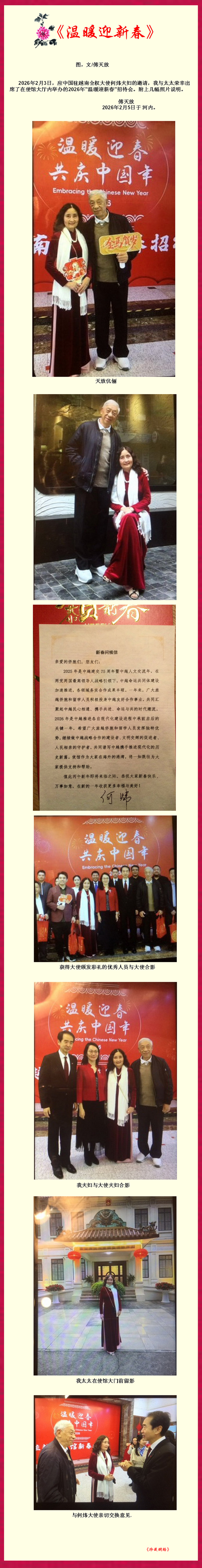 注:作品以大使新春问候信与招待会场景为灵感,通过“红梅映牖”“北斗南疆”等意象展现外交盛事中的文化血脉。颔联化用建交75周年里程碑,颈联撷取合影、赠礼等温馨画面,尾联以“根系炎黄”呼应命运共同体主题,全诗将传统诗韵与现代外交风云交融,体现“春色满园”的和美意境。