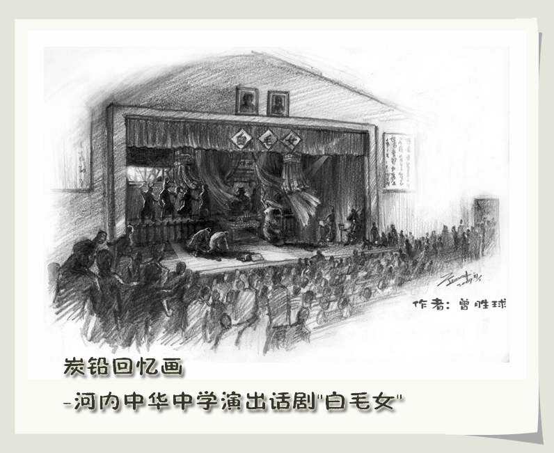 炭铅回忆画__河内中华中学演出话剧“白毛女”(画作/曾胜球)