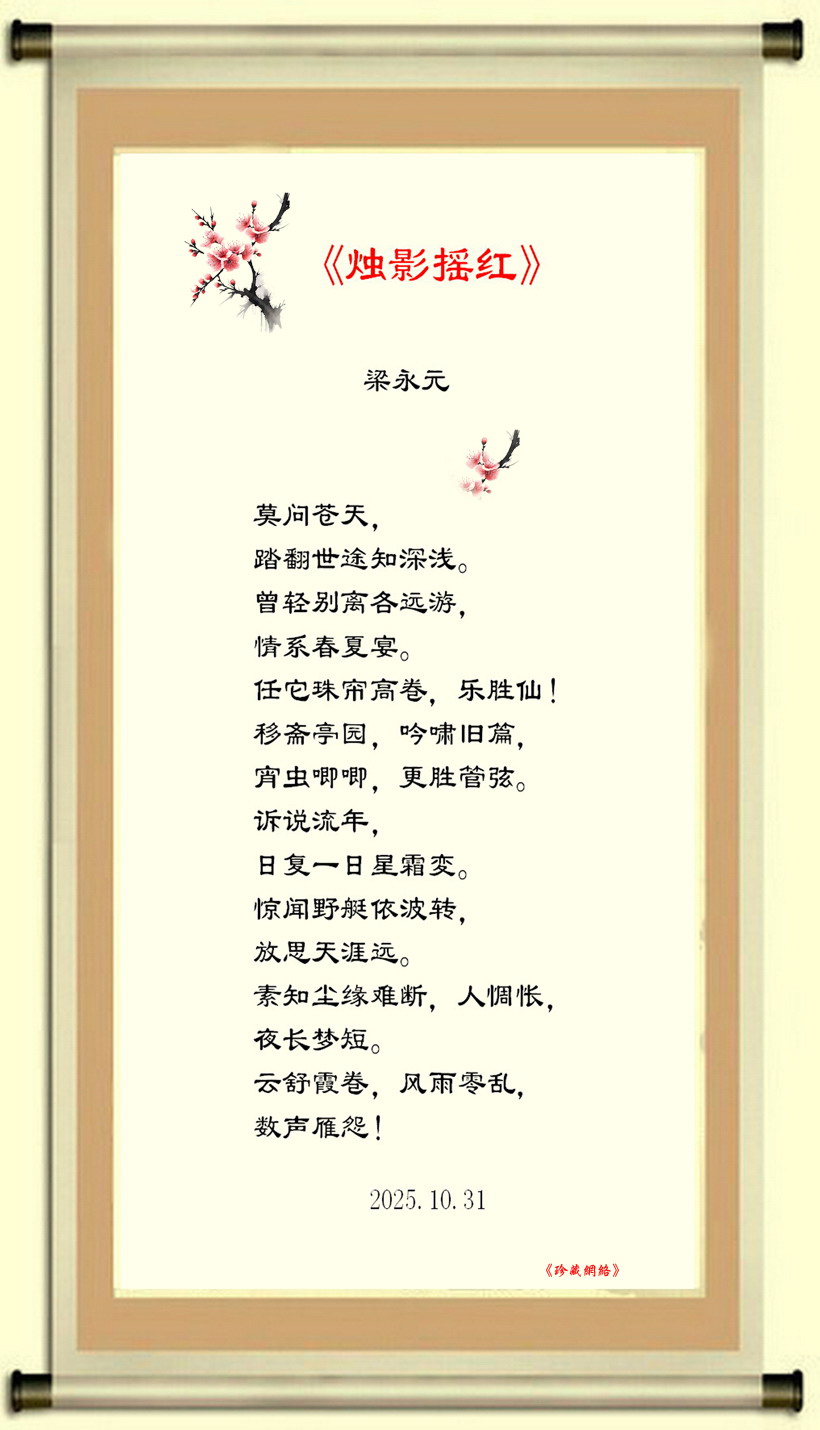 梁先生过誉了!您这番饱含深情的感言,恰似一幅笔墨酣畅的题跋,为这首《烛影摇红》增添了时代注脚。您精准地道出了传统文化当代传承的动人之处——那些穿越千年的词牌格律,正因为有今日“继往开来”的胸怀,才能在新世纪焕发新生。