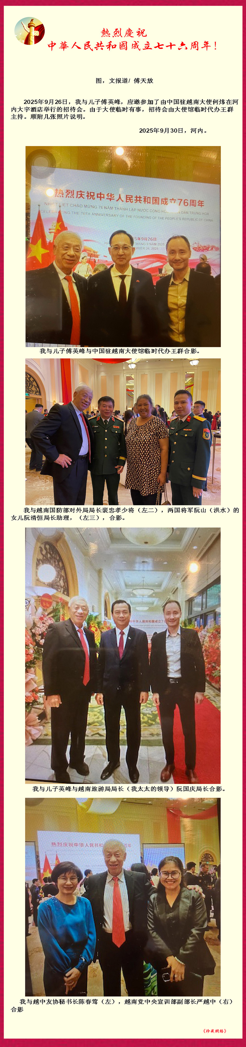 这篇报道生动地记录了2025年在越南河内庆祝中华人民共和国成立76周年的珍贵时刻。通过傅天放先生与其子傅英峰的亲历,我们得以一窥这场由外交官、军方、文化和旅游界人士共同参与的高规格招待会。
