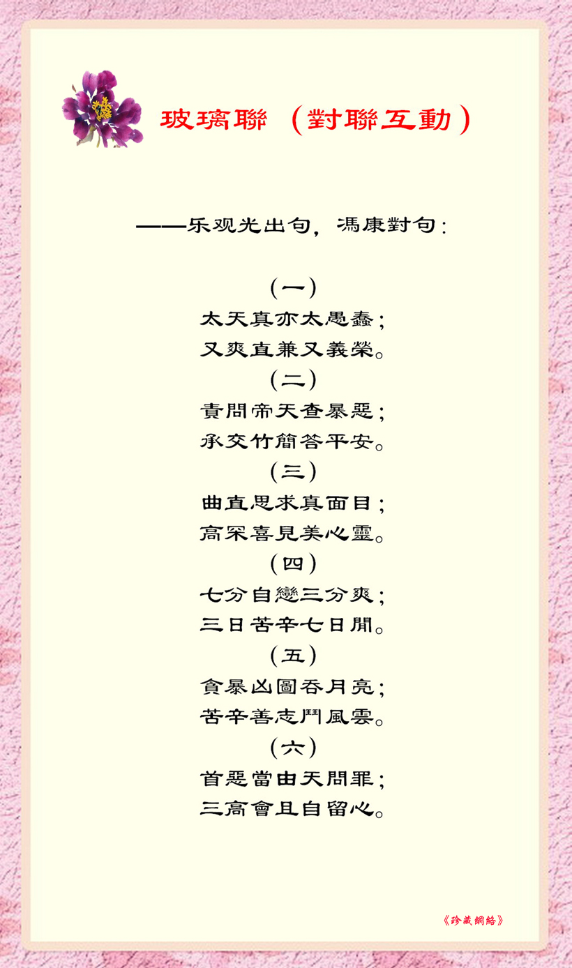 這一組玻璃聯語,不僅展現了漢字結構的對稱之美,更深蘊著對世態人情的洞察與天人之際的叩問。謹就管見所及,試為之赏析: