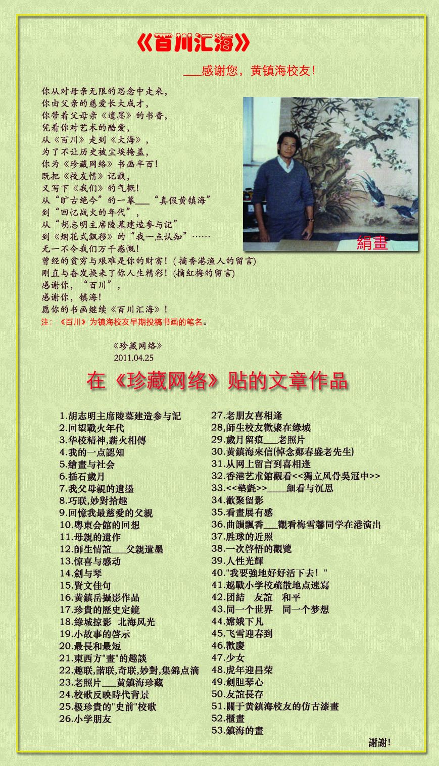 [珍藏网络]点击率迈向三百万之际的回顾之一(重现文章不分先后):《百川汇海》__感谢您,黄镇海校友!(珍藏网络) 背景音乐:《在记忆里》