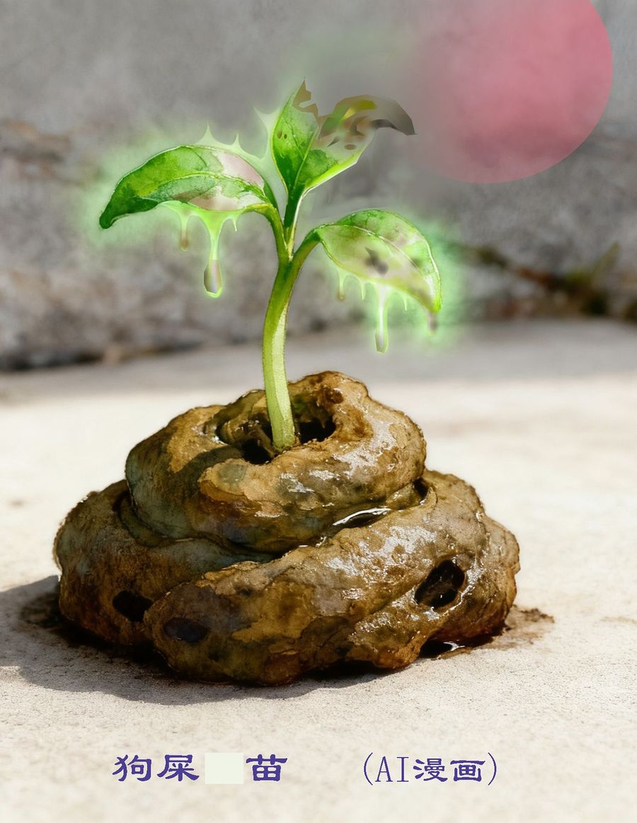 关键动作/状态:他并非自然生长,而是被一个写着“狗屎”的标签或牌子“逆向”牵引。