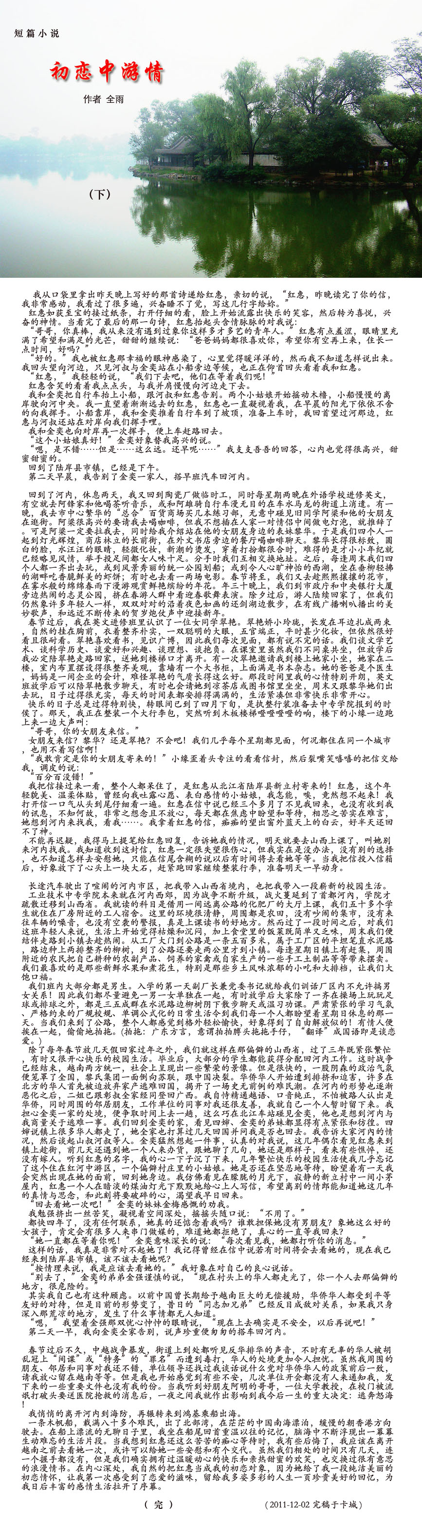 [短篇小说] 初恋中游情(下)( 作者/全 雨)