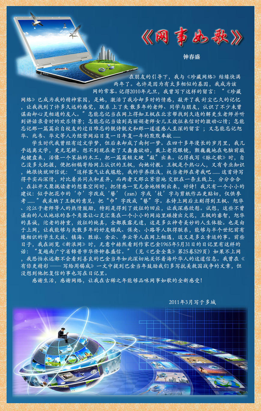 钟老师对我的夸奖让我汗颜,在学校我成绩平平,走入工作岗位也毫不起眼,因为周围能人太多,我只有以勤补拙才行。没想到钟老师还留着我的信,老师过谦了。在珍藏网上,是众位老师和学长给了我很好的启示,教我学诗、品诗和为人,我能拿出自己的小诗放到大家面前接受检验,是珍藏网带给我的机会,能得到老师学长的帮助和鼓励,也增强了我的勇气和信心。感谢钟老师!感谢大家!感谢默默奉献的学长们!是大家的团结和向心力,维护了这个不可多得的精神家园,也维护了我们心中向往的美好。