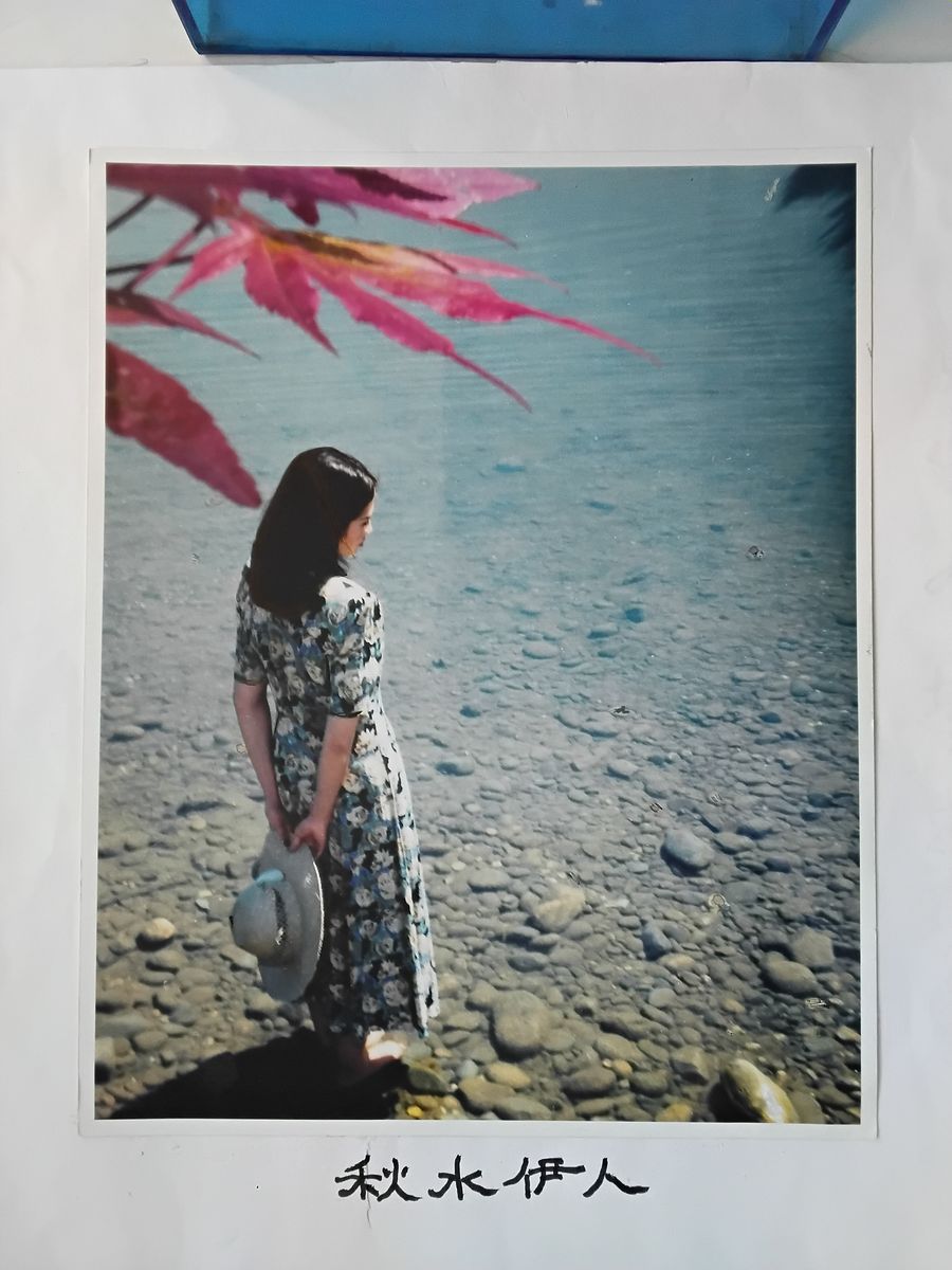 *构图与色彩的对话: 左上角那一抹红枫叶,是整幅画面的点睛之笔。它不仅点明了季节(秋),更以其热烈的色彩与画面主体的大面积冷色调(蓝色连衣裙、绿色河水)形成微妙的对比与平衡。枫叶仿佛是伊人内心炽热情感的向外投射,又与她的沉静外表形成张力。