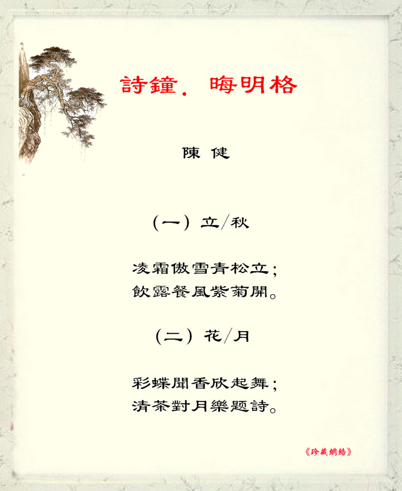 技巧与对仗:上联“立”字明嵌,以青松之挺立展现坚韧;下联暗扣“秋”意,借紫菊之开放点明季节。对仗极为工稳,“凌霜傲雪”与“饮露餐风”既呈四字叠景,又通过“青松”“紫菊”的色彩对比,强化视觉张力。