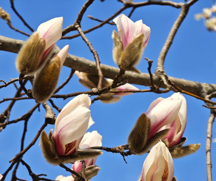 玉兰之名,源于“色白微碧,香味似兰”。晴空之下,有的已然怒放,