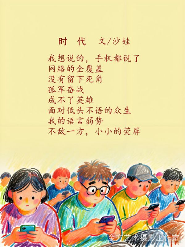 诗人运用“荧屏”作为核心转喻,一方冷光便足以使语言溃败。这种“弱势”并非能力的退化,而是交流生态的结构性重组——当所有话语都必经数字界面过滤,未经编码的肉身声音便成了不可见的暗物质。“低头不语”这一重复的身体姿态,既是臣服也是无言的抵抗,既是虔诚也是冷漠。