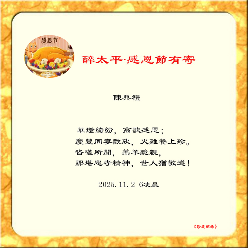 这首《醉太平·感恩節有寄》以中西文化交融的笔触,既描绘了西方节日的欢庆场景,又融入了中华传统伦理的思考,形成独特的艺术张力。让我们一同细品其中韵味: