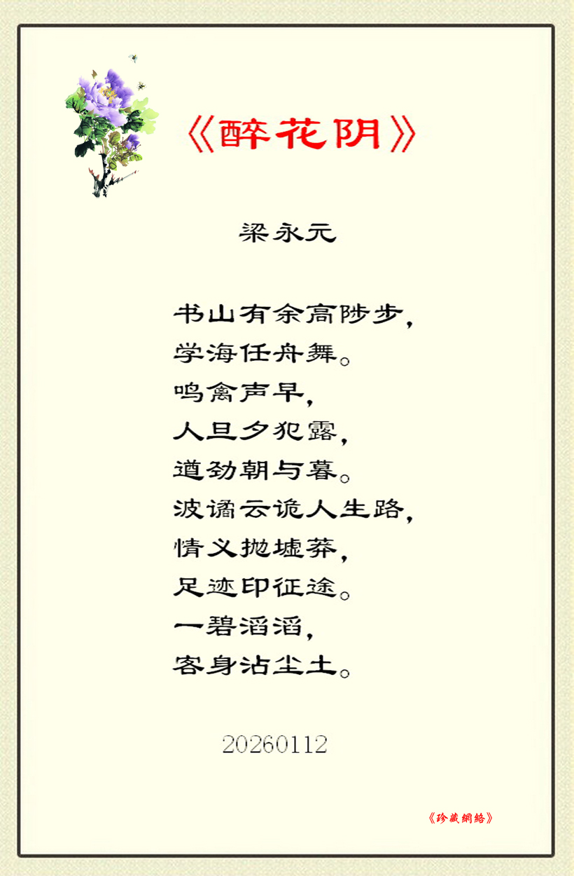 《醉花阴》这一词牌传统上以婉约清丽见长,而梁永元先生此作却另辟蹊径,将书山学海的求索意象与人生征途的苍茫感融为一体。上阕“书山有余高陟步,学海任舟舞”化用经典而翻出新意,以“鸣禽声早”“犯露”等晨间意象勾勒出砥砺前行的身影。下阕笔锋陡转,“波谲云诡人生路”如奇峰突起,将个体生命置于浩瀚时空之中。末句“客身沾尘土”尤其精警,既是对风尘仆仆的写实,亦暗含对生命本质的哲学叩问。