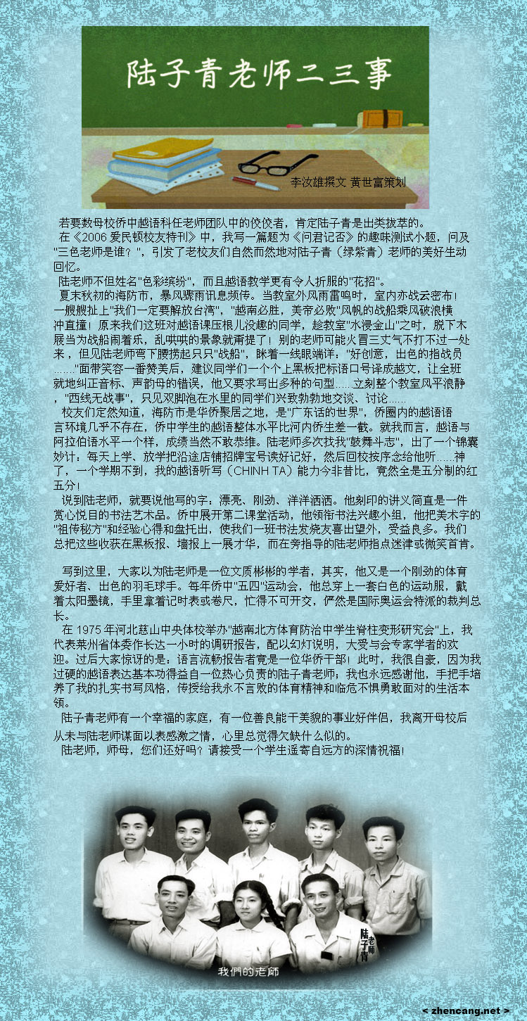 总而言之,陆子青老师是一位将智慧、爱心、才华与责任感融于一身的优秀教师。他懂得尊重学生天性,善于激发学生潜能,并用自己的人格魅力潜移默化地影响着学生。这篇文章不仅是对一位好老师的深情礼赞,也是对那个时代侨校师生情谊和教学风貌的珍贵记录。(来自DeepSeek)