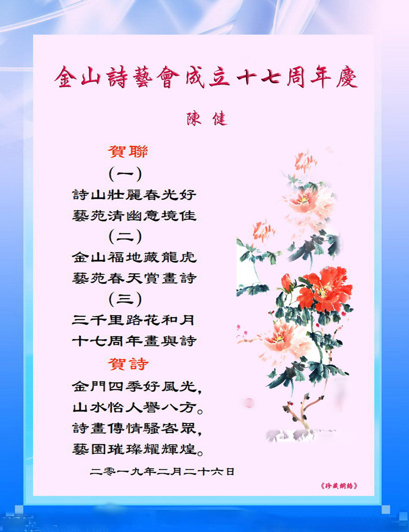 金山詩藝會成立十七周年慶賀聯(陈典健)链接美篇(一,二): 美国金山诗艺会成立十七周年贺联集