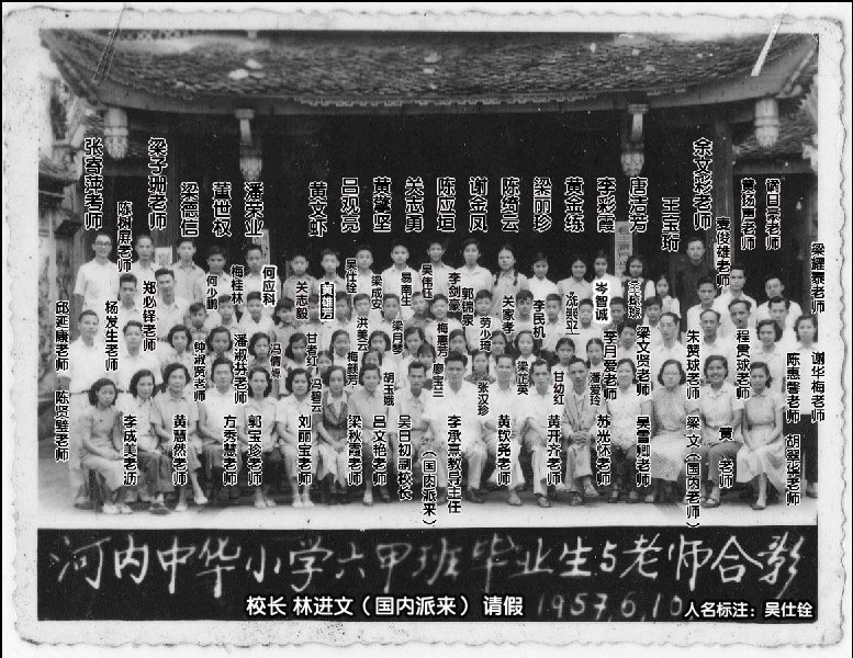 黑白老照片《人名全标注的1957年河內中华小学六甲班毕业生与老师合影》