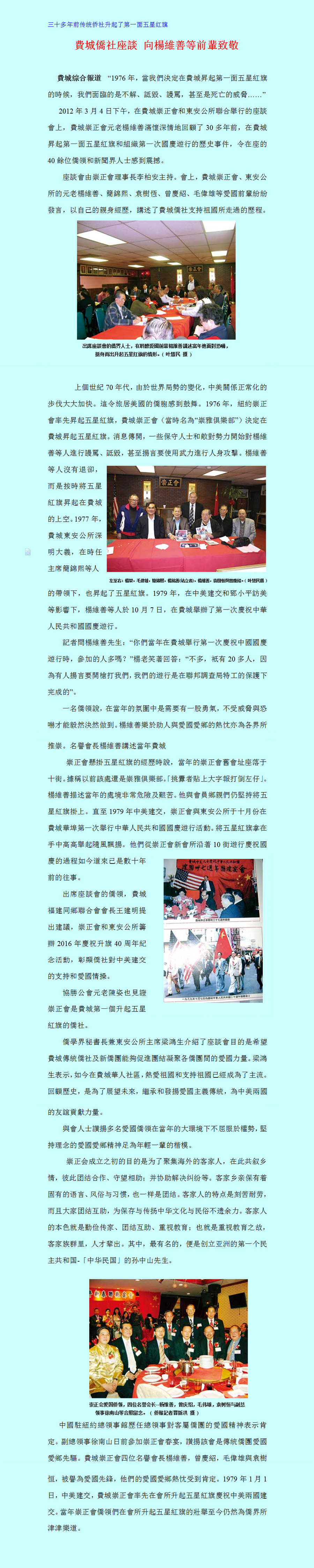 *崇正会和东安会所在上世纪70年代就开始升挂五星红旗,是费城地区最早升挂五星红旗的侨社。升挂中华人民共和国国旗,表明了乡亲们拥护一个中国,反对“台独”的坚定立场,这符合美国政府奉行的一个中国政策,是顺应时代发展潮流的明智之举,也是广大侨胞支持祖国统一的大义之举。